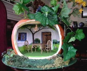This mouse uses 2 pumpkins for a cottage. One is a living room. One is a bedroom.