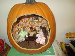 This is a Thanksgiving diorama. But you have to admire the different colored pumpkins inside.