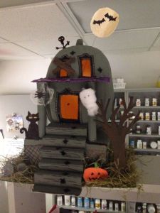 The inside decor is made of paper. You can see a witch flying in front of the moon.