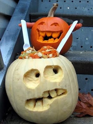 This one has a skeletal bridal couple near a grave stone. A crow sits on top the pumpkin.