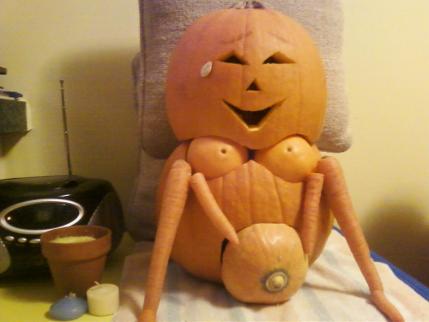 The doll’s dressed as a lion. Candy’s on the table with the jack-o’-lanterns.