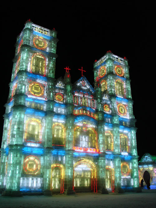 Of course, this is Harbin during its snow and ice festival. And, yes, the ice buildings are lit up like that for the night display. Spectacular isn't it?