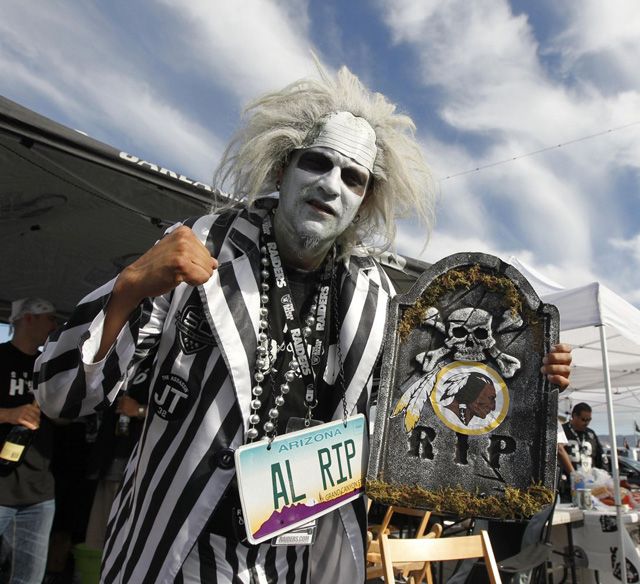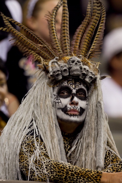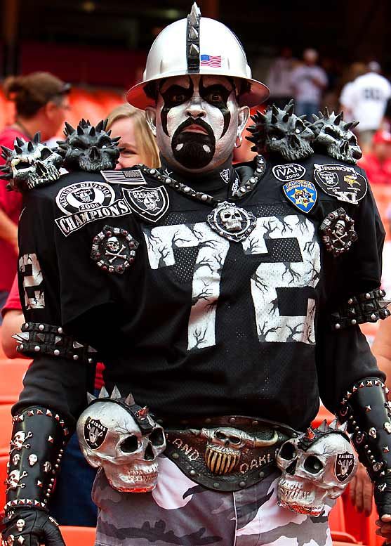 Yes, all decked out in his chains and armor, this skeleton warrior wants nothing more than to show support for his team and enjoy the game. Seems like a lot of Raiders fans have some outlandish costumes for some reason.