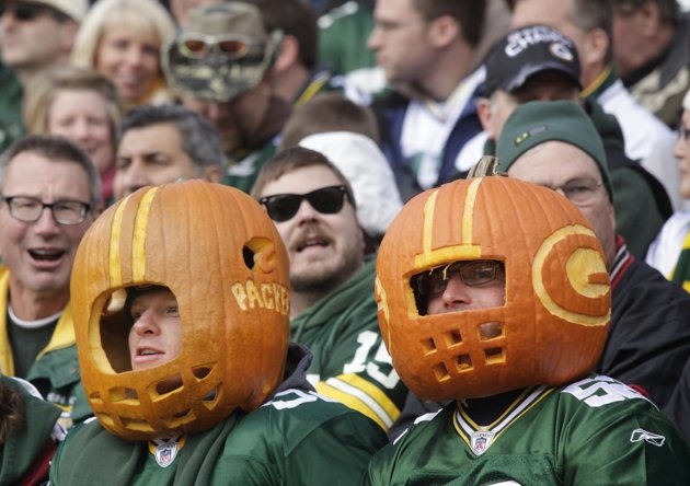 16. Nothing shows your love for the Green Bay Packers than wearing helmets carved out of pumpkins.