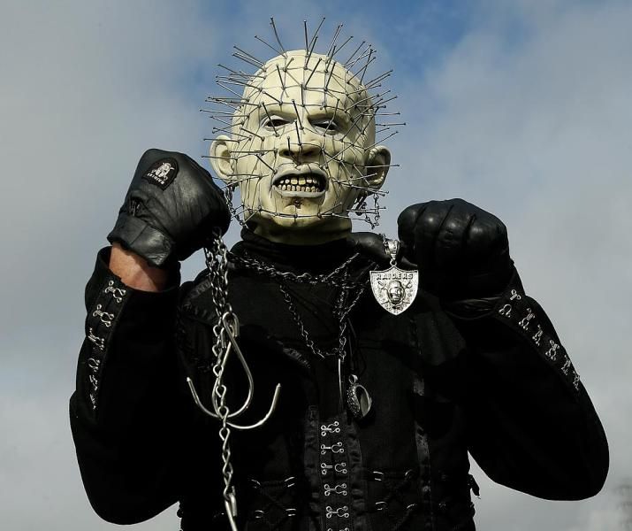 While Hellraiser may look like a slasher horror movie villain, he’s actually an Oakland Raiders fan. And he just dresses that way to support his team. He’s really nothing to worry about.