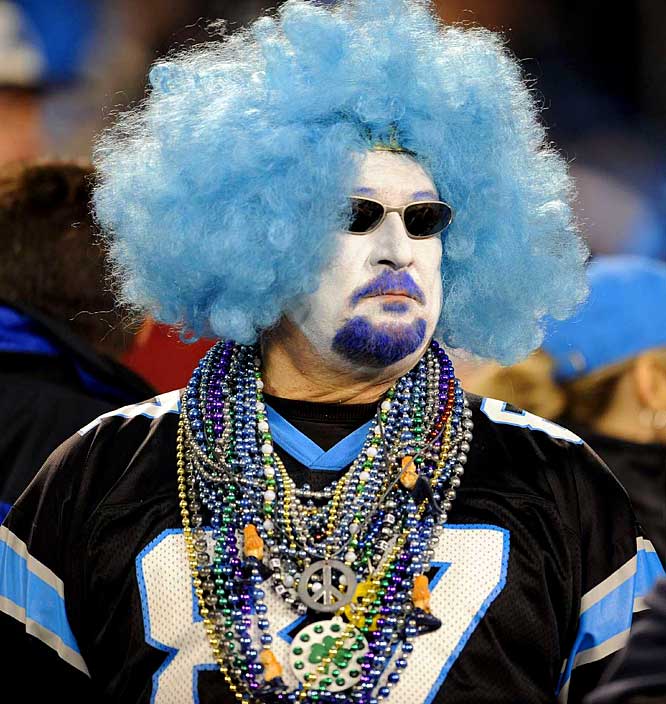 85. Of course, you can’t show your support for the Carolina Panthers without make up and a goofy blue wig to go with it.