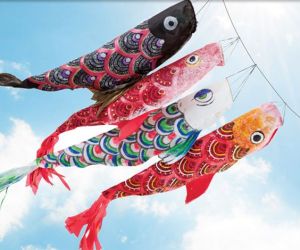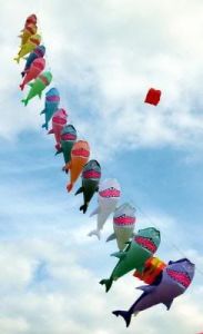 These fish kites are all on a line as the wind blows through them. And all of these probably come from Asia.